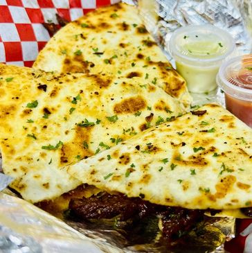 Crispy flour quesadilla filled with melted Mexican cheeses, grilled onions, fajita beef, green and red salsa